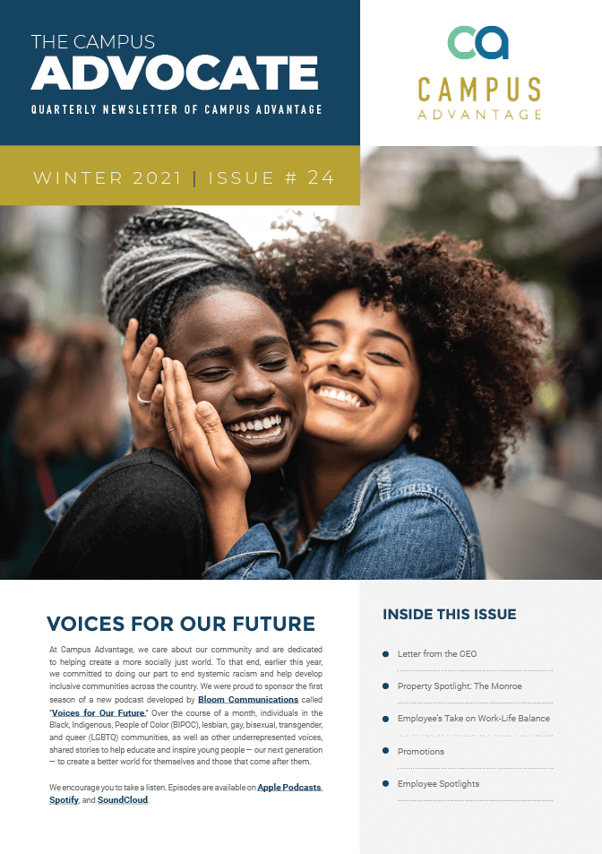 At Campus Advantage, we care about our community and are dedicated to helping create a more socially just world. To that end, earlier this year, we committed to doing our part to end systemic racism and help develop inclusive communities across the country. We were proud to sponsor the first season of a new podcast developed by Bloom Communications called “Voices for Our Future.” Over the course of a month, individuals in the Black, Indigenous, People of Color (BIPOC), lesbian, gay, bisexual, transgender, and queer (LGBTQ) communities, as well as other underrepresented voices, shared stories to help educate and inspire young people — our next generation — to create a better world for themselves and those that come after them.